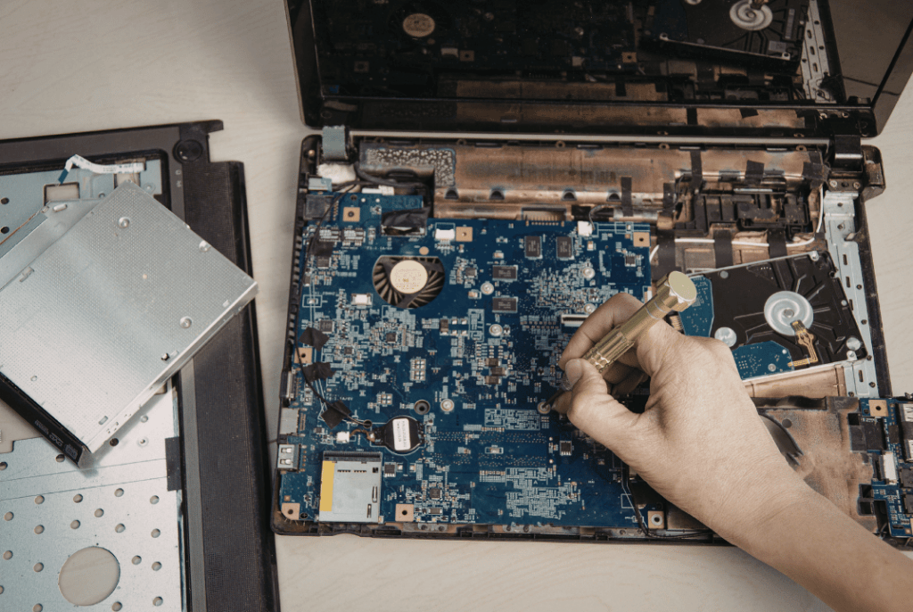 Older or damaged laptops are often not suitable for reuse. In these cases, devices are dismantled so materials can be recovered.